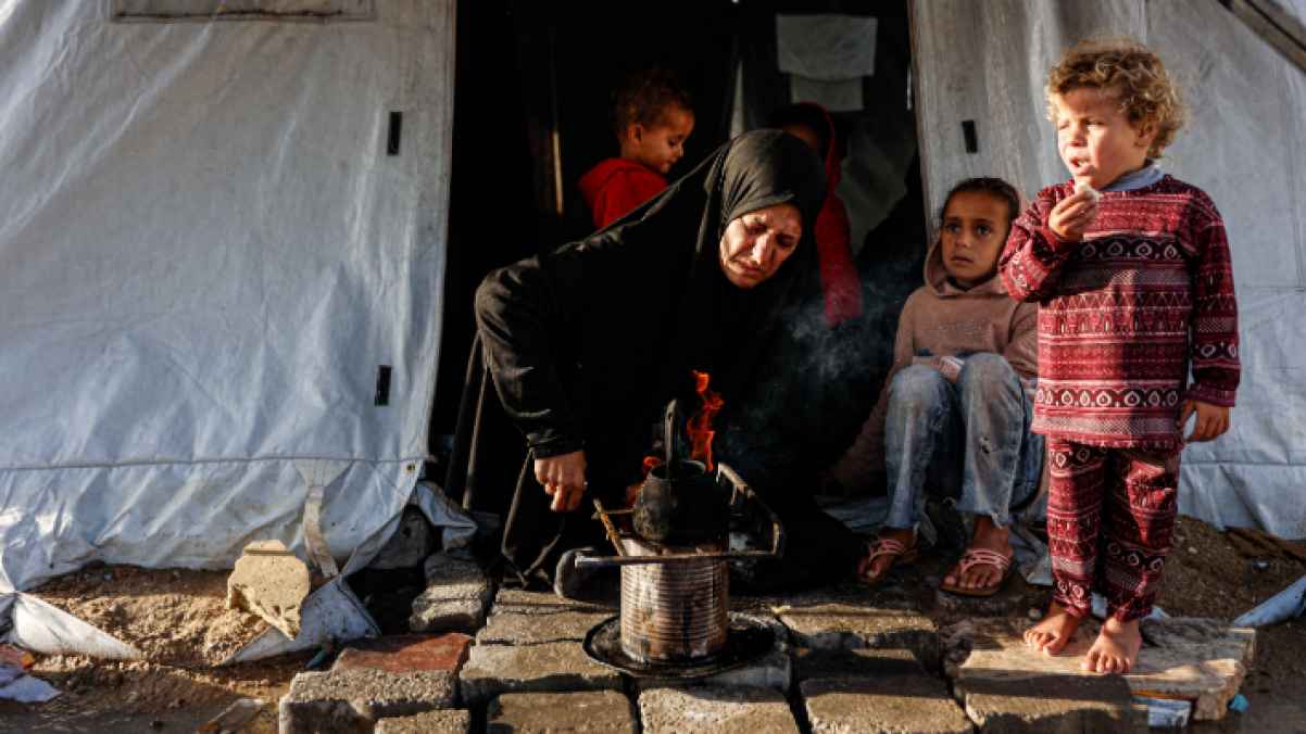 Under a sky heavy with rain and winter cold, a displaced Palestinian woman sits in front of her worn tent in Gaza City, lighting a fire to heat a small pot, while children with weary eyes gather around her, waiting for warmth that never comes. A simple scene in its details, yet one that captures the harshness of a life imposed on thousands of families who found themselves with no shelter but fabric.