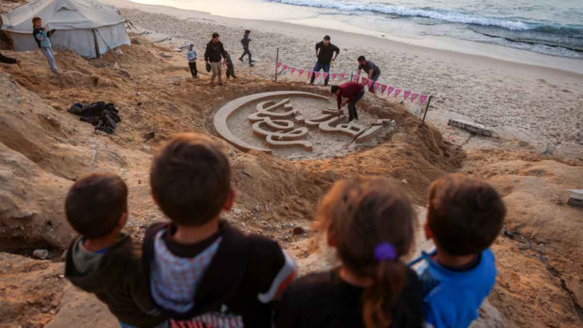 Yazeed, who was forcibly displaced from his hometown of Beit Lahia in the northern Gaza Strip, carried his simple tools to the shore not to create a passing artwork, but to write the story of a people who refuse to abandon their spiritual rituals, even in the harshest moments. Here, there are no decorations and no illuminated streets, yet the sand itself has become a pulpit of hope.