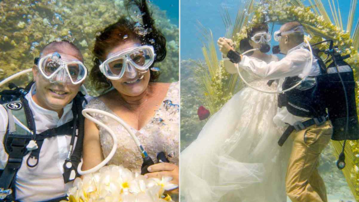 The bride and groom, Sibylle Blumenthal and Rob Buurveld, both 55, exchanged vows on April 6 during a diving ceremony held in Cap Malheureux in the north of the island. They explained the idea came after 12 years of diving together, which made the sea feel like “the place closest to their hearts.”